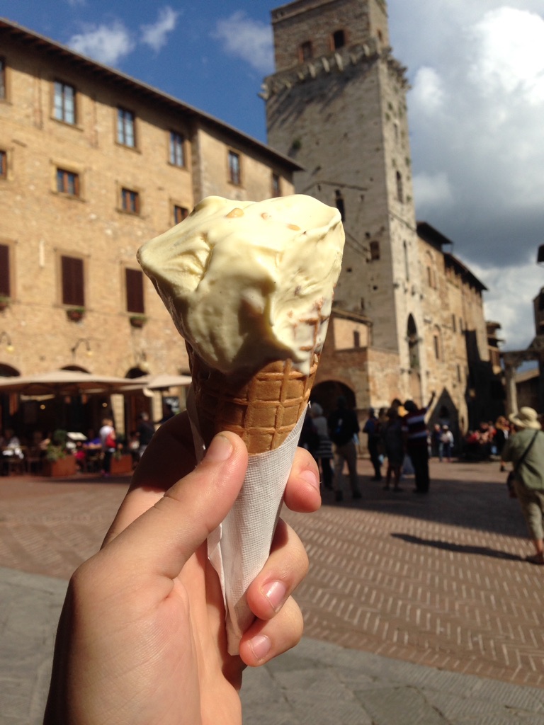 Saindo de Volterra, à 31 km (30min) chegamos em San Gimignano, famosa também por ser a casa do melhor sorvete do mundo, que você não pode deixar de provar – quem o faz é a Gelateria Dondoli, na praça principal da cidade, a Piazza della Cisterna. San Gimignano também fica em uma colina, ou seja, a vista dos campos da Toscana é belíssima! É cercada por uma muralha e sua entrada principal se dá pela Porta San Giovanni. Você deve estacionar o carro do lado de fora (os estacionamentos são muitos, não é difícil encontrar vaga e, apesar de pagos, o valor é bem baixo), e seguir pela via principal, cheia de lojinhas de souvenirs, bares e restaurantes, e ir até a praça do sorvete (haha assim fica fácil lembrar, né?). Ao lado da Piazza della Cisterna tem uma pequena viela que leva à praça do Duomo (sim, a esta altura da sua viagem pela Itália você já percebeu que toda cidade italiana tem um Duomo).